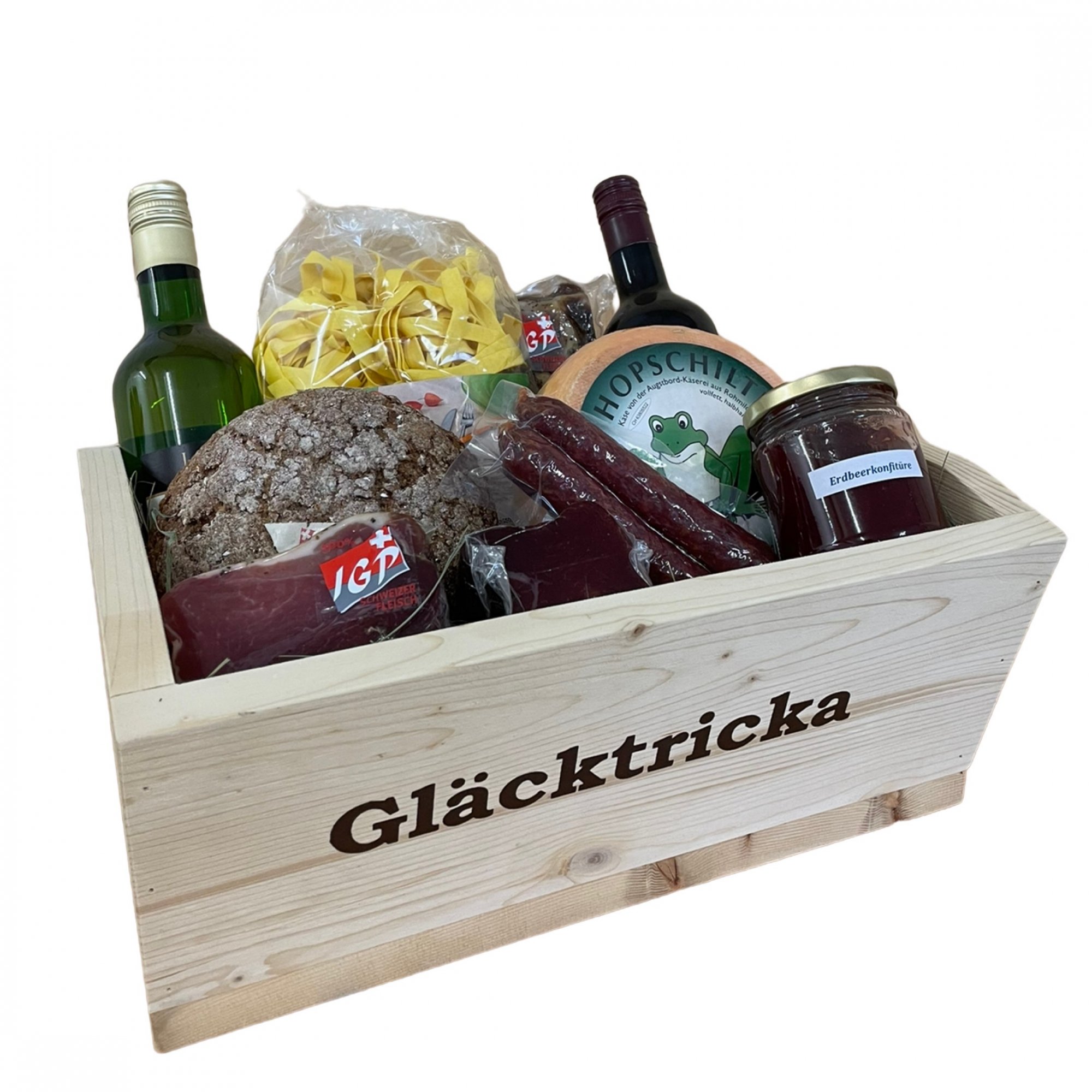 Die "Gläcktricka", die echt nachgemachte Futterkiste, wird in den Eingliederungs- und Dauerwerkstätten in Bitsch hergestellt, natürlich aus Walliser Holz. Gefüllt wird sie mit Liebe von unseren Mitarbeitenden ausschliesslich mit "Walliser Spiis".