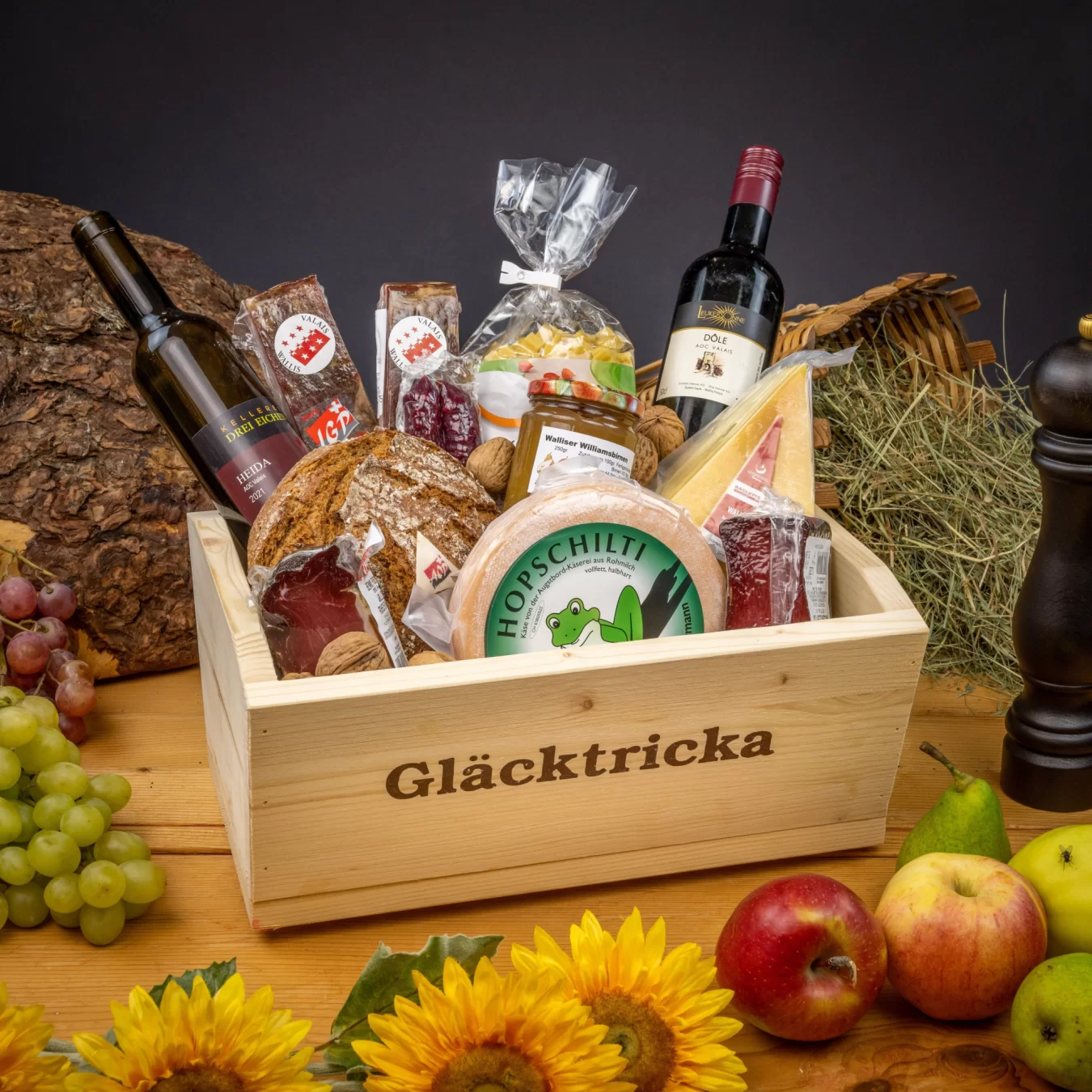 Die Gläcktricka mit Walliser Spiis erhalten Sie in mehreren Variationen. Jede Gläcktricka wird individuell nach Budgetrahmen zusammengestellt und kann eine Auswahl der aufgelisteten Produkte enthalten: