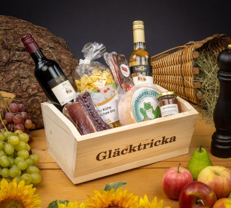 Die Gläcktricka mit Walliser Spiis erhalten Sie in mehreren Variationen. Jede Gläcktricka wird individuell nach Budgetrahmen zusammengestellt und kann eine Auswahl der aufgelisteten Produkte enthalten: