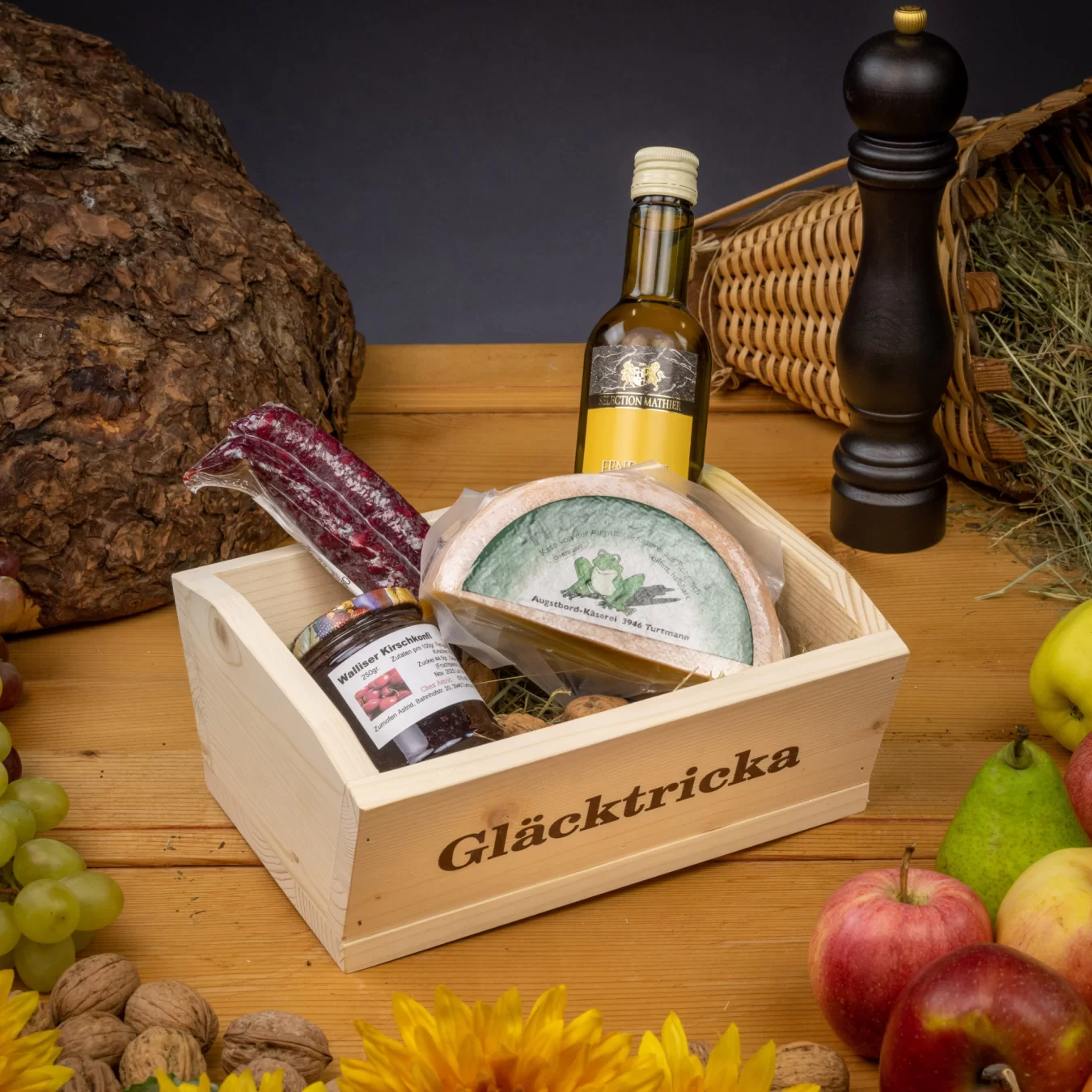 Die Gläcktricka mit Walliser Spiis erhalten Sie in mehreren Variationen. Jede Gläcktricka wird individuell nach Budgetrahmen zusammengestellt und kann eine Auswahl der aufgelisteten Produkte enthalten: